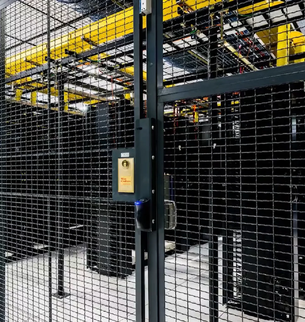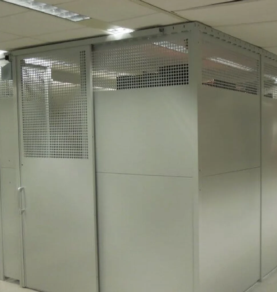 Physically isolated caged infrastructure with a dedicated door providing restricted access, limited to authorized personnel only.
